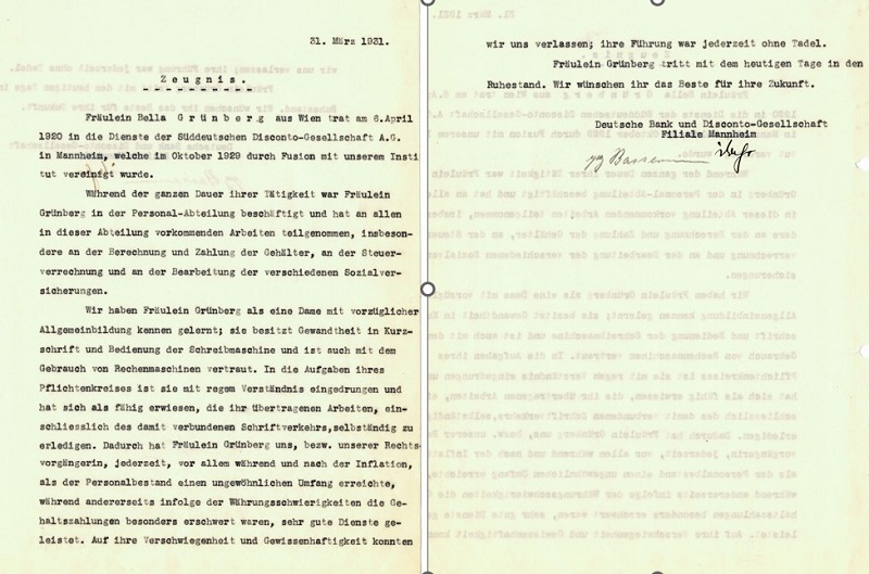 Isabella (Bella) Grünberg came from a Jewish family in Vienna. Her father, Arnold Aron Grünberg (28 February 1840 in Brody (near Lviv) - 29 October 1880 in Vienna), was the director of a glass factory in Vienna. Her mother was Fanni Grünberg-Tafler née Manheimer (born 1845 in Fürth). She attended the higher girls' school and the commercial school in Vienna and completed a preparatory course as a teacher of French. From 1891 to 1919, she worked as a governess and housekeeper for upper-class families in Vienna, Bamberg and Mannheim. In spring 1920, she joined Süddeutsche Disconto-Gesellschaft in Mannheim as an employee, where she worked in the personnel department. She conducted correspondence independently and was valued for her "excellent general education" and her work ethic during hyperinflation. When Süddeutsche Disconto-Gesellschaft merged into the newly formed Deutsche Bank und Disconto-Gesellschaft in October 1929, Bella Grünberg was taken over by its Mannheim branch. The general staff reduction following the merger and the global economic crisis led to her retirement on 1 April 1931. She received a transitional allowance of 1000 Reichsmark and an annual pension of 1600 Reichsmark. |