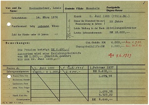 career: | 08.05.1896 - 16.07.1899 Rheinische Creditbank Karlsruhe branch (apprenticeship) 17.07.1899 - 12.04.1902 Rheinische Creditbank, Mannheim (employee in the correspondence department) 13.04.1902 - 29.10.1929 Rheinische Creditbank Karlsruhe branch (most recently head of securities administration) 30.10.1929 - 31.12.1929 Deutsche Bank und Disconto-Gesellschaft Karlsruhe Branch (head of securities administration) |