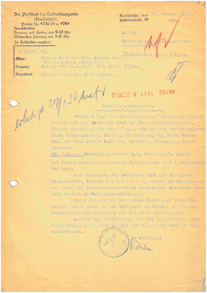 Max Levi was the son of the cattle dealer Heinrich Levi in Breisach. After graduating from secondary school in Breisach, he began an apprenticeship as a banker at the Freiburg branch of Süddeutsche Disconto-Gesellschaft in 1918. He stayed there after completing his apprenticeship and worked in various departments. After a short time at the Mannheim head office of Süddeutsche Disconto-Gesellschaft in the autumn of 1929, Levi returned to the Freiburg branch. Due to the merger of Deutsche Bank and Disconto-Gesellschaft, which also included Süddeutsche Disconto-Gesellschaft, he was now working for the Freiburg branch of the Berlin big bank. There he was employed in the foreign exchange and reimbursement business and was valued by the management for his independent work. |