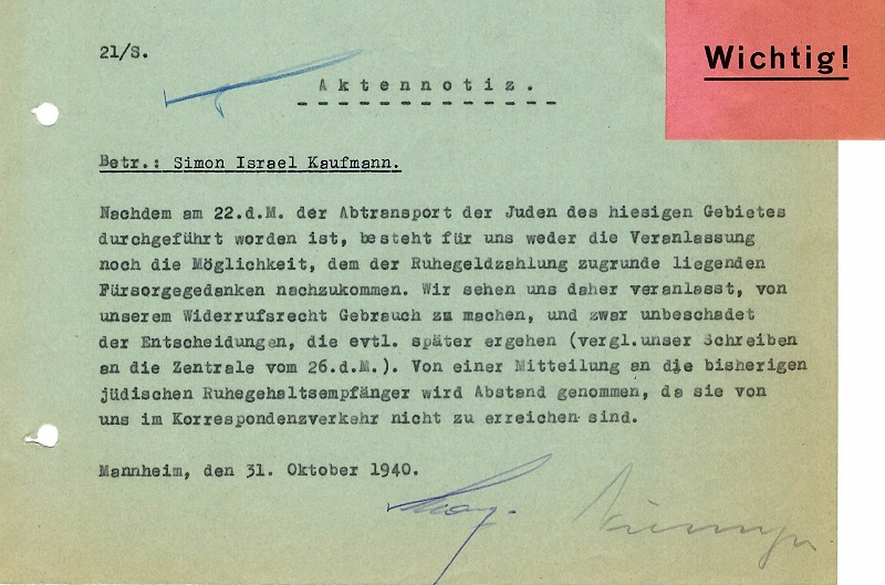 life: | Albert Lingert came from a Jewish family in Ettlingen near Karlsruhe. He attended the Oberrealschule in Karlsruhe until the second-to-last year of secondary school and listened to lectures at the commercial college until he began a banking apprenticeship at the Karlsruhe branch of Rheinische Creditbank in May 1896. After completing his apprenticeship, he moved to the head office of Rheinische Creditbank in Mannheim in 1899, but returned to the Karlsruhe branch in 1902. There he worked until 1929 in vault administration and most recently as head of securities administration. Immediately after Rheinische Creditbank and its branches had been absorbed into the merged Deutsche Bank und Disconto-Gesellschaft in October 1929, Lingert received a pension offer. The main reason for his early retirement, in addition to the general staff reduction as a result of the merger, was Lingert's severe hearing impairment. The annual pension amounted to 3000 Reichsmark, which was paid until October 1940. Albert Lingert remained unmarried; his health condition was critical. After the Nazi seizure of power, he suffered a nervous breakdown in 1933 and was treated at the Hohenfreudenstadt psychiatric hospital near Freudenstadt in the Black Forest. Since he could not pay the treatment costs, his brother Dr. Karl Lingert, a district court judge in Ettlingen, approached Deutsche Bank und Disconto-Gesellschaft with a request for assistance, which granted a subsidy of 200 Reichsmark. In 1936, Albert Lingert moved from Karlsruhe to Freiburg, where he lived at Heimatstrasse 2 with Maria Barthel, an unmarried "small annuitant." On 22 October 1940, Albert Lingert – like many Jews from Baden and Saar-Palatinate – was deported to the internment camp of Gurs in southwestern France. He died there eight months later. |