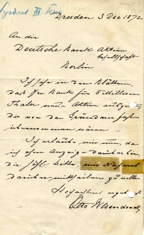 Als die Deutsche Bank im März 1870 gegründet wurde, verteilte sich ihr Aktienkapital von 5 Millionen Talern auf 76 Zeichner, darunter zahlreiche Bankhäuser und Privatpersonen aus der Finanzwelt. Für ein in der Rechtsform der Aktiengesellschaft errichtetes Unternehmen gelten sie praktisch als dessen Gründer. Unter den Erstzeichnern waren – kaum verwunderlich – die beiden geistigen „Väter“ der Deutschen Bank Adelbert Delbrück (mit 112.000 Talern) und Ludwig Bamberger (mit 18.800 Talern) sowie mit überschaubaren 5.000 Talern der künftige "Macher" des Unternehmens Georg Siemens. Bei den folgenden Kapitalerhöhungen wurden die "Gründer" wiederum zur Zeichnung aufgerufen. So im Dezember 1872 als zur "Errichtung einer Filiale in London, sowie Dotirung von Commanditen in New York und Paris" das Grundkapital zum zweiten Mal um 5 Millionen Taler erhöht wurde. Schon im Vorfeld dieses Aufrufs hatten Zeitungen von der geplanten Kapitalerhöhung berichtet. Daraufhin wandten sich einige Erstzeichner umgehend an die Deutsche Bank, um Näheres über die Emission zu erfahren. Zu ihnen gehörte auch der Kaufmann Otto Wesendonck, der bei der Gründung der Deutschen Bank 1870 mit 68.200 Talern einen ansehnlichen Betrag gezeichnet hatte. Aus der Textilstadt Elberfeld (heute ein Stadtteil von Wuppertal) stammend, betätigte er sich zusammen mit seinem Partner William Loeschigk, der ebenfalls zu den Erstzeichnern des Aktienkapitals der Deutschen Bank zählte, sehr erfolgreich im Seidenhandel. 1851 ließ er sich in Zürich nieder und errichtete dort ein prächtiges Anwesen (in der heute teilweise das Museum Rietberg für außereuropäische Kunst untergebracht ist). 1871 siedelte Wesendonck nach Dresden über, von wo aus er auch obiges Schreiben an die Deutsche Bank richtete. Otto Wesendonck ist der Nachwelt eigentlich nur dank seiner zweiten Ehefrau Mathilde in Erinnerung geblieben – für das 19. Jahrhundert ein eher seltener Fall. Mathilde Wesendonck war in den 1850er Jahren zeitweilig die geistige Muse Richard Wagners. Ohne diese Beziehung, so ein weit verbreitetes Urteil der Musikwissenschaft, wäre das Liebesdrama "Tristan und Isolde", eines der bedeutendsten Bühnenwerke der Romantik, nicht denkbar. Die Wesendoncks standen mit dem Komponisten, der 1849 als politisch Verfolgter aus Deutschland geflohen war, seit 1852 in freundschaftlichem Kontakt. Otto Wesendonck unterstütze den notorisch in Geldnöten befindlichen Wagner großzügig und ermöglichte ihm in Zürich zu wohnen und zu arbeiten. Zwischen Wagner und Mathilde Wesendonck entwickelte sich eine tiefe "Seelenfreundschaft". Wagner vertonte fünf Gedichte Mathildes, die sogenannten Wesendonck-Lieder, zwei davon bezeichnete Wagner ausdrücklich als Vorstudien zu "Tristan und Isolde". Wagners damalige Ehefrau Minna vermutete – wohl zu Unrecht – hinter der Beziehung mehr als ein platonisches Verhältnis und wollte es auf einen Eklat ankommen lassen. Die Wesendoncks reagierten indem sie den Kontakt zu Wagner weitgehend abbrachen, was Otto Wesendonck aber nicht daran hinderte, den Musikdramatiker weiterhin zu unterstützen.